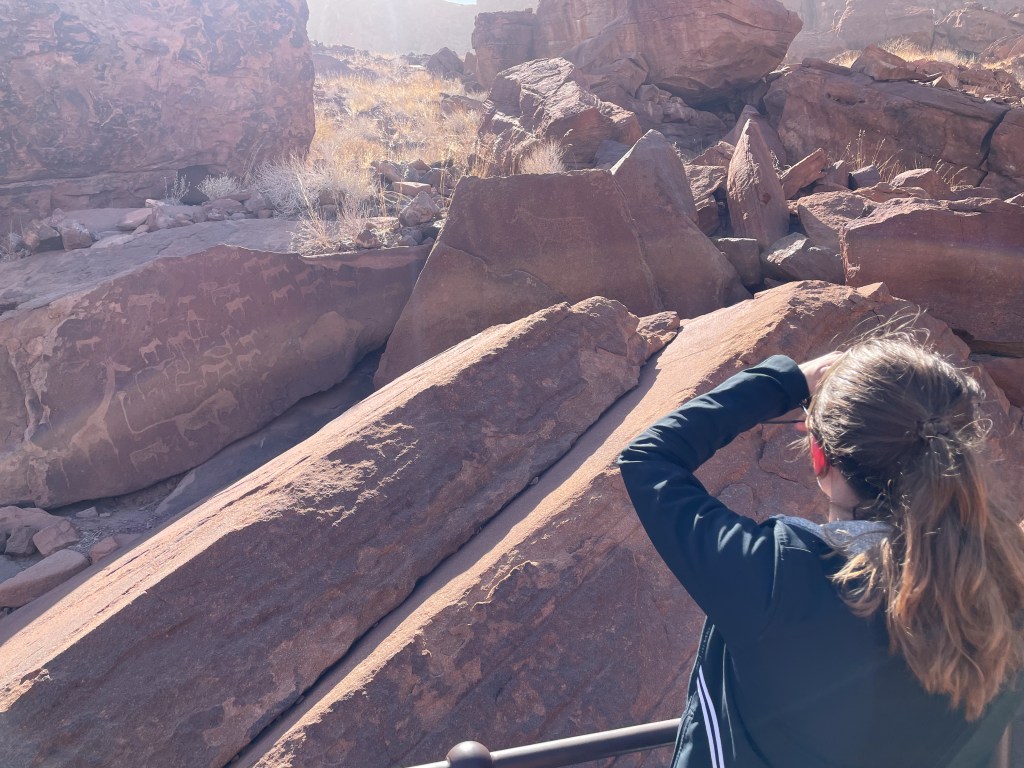 Twyfelfontein is a rocky outcrop in Damaraland which has been home to various people over thousands of years. The common Afrikaans name translates as “doubtful fountain” hinting at the lack of water in the area, and the sporadic nature of when it appears. The local name is much harder to pronounce “ǀUi-ǁAis” where the vertical bars signal a click sound which seems to be uttered at the same instance at the main syllables. It’s fun to try, but ultimately impossible for us to get it right.