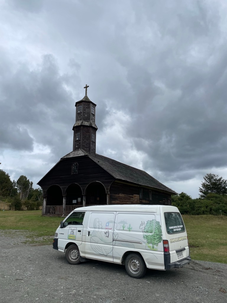 Instead we dashed down the motorway to Chiloe, an island famed for its rain. To be fair it’s famous for other things too. Principally wooden churches which are unique, but not all that old, Gigantic fish soups, and whale watching.