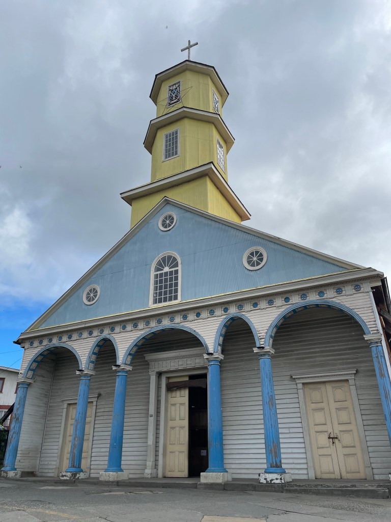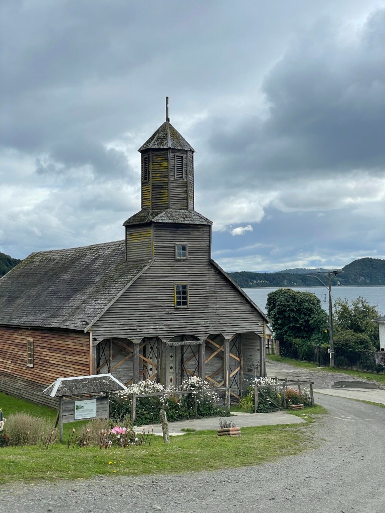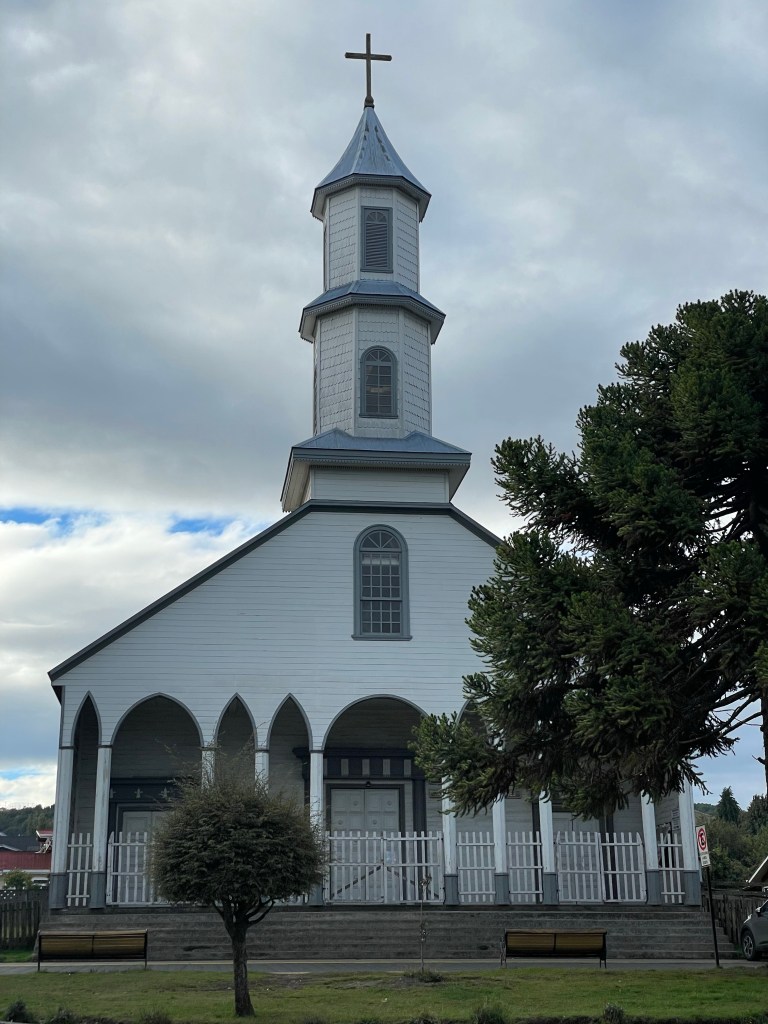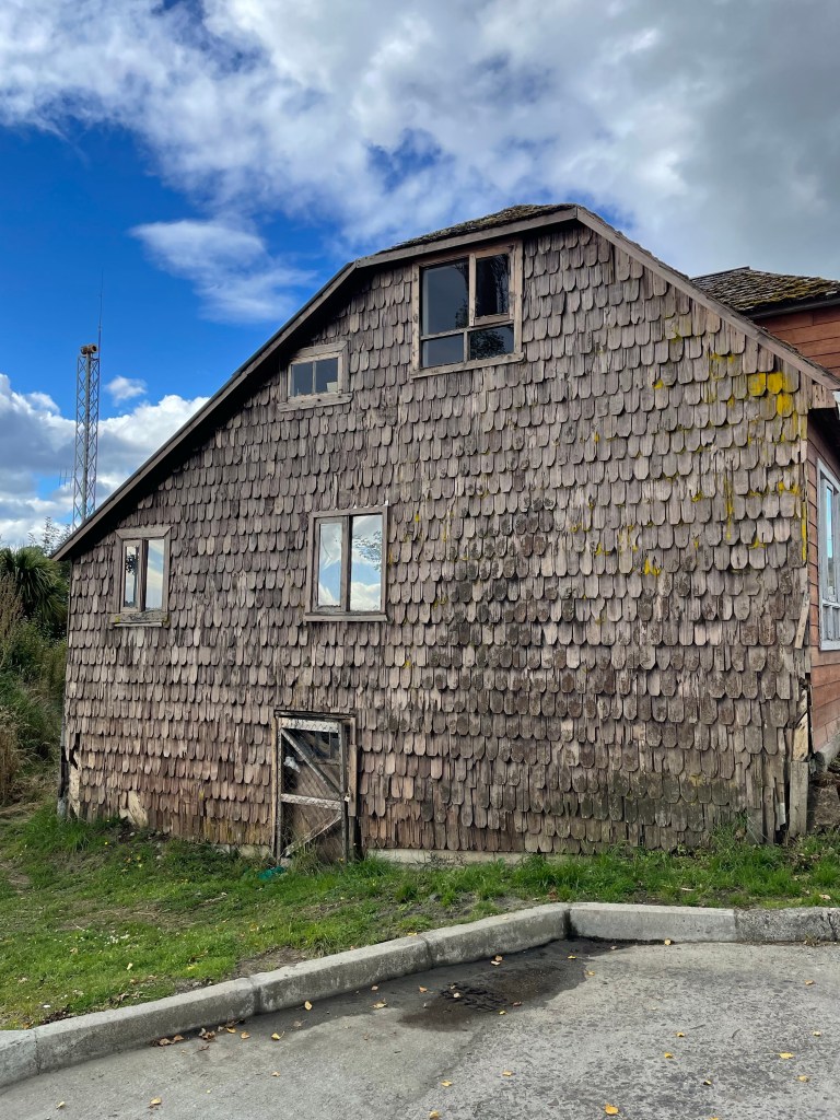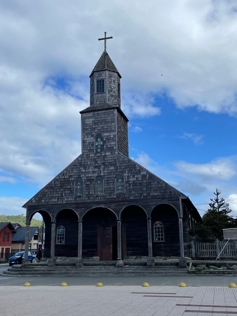 The wooden churches of Chiloé are UNESCO famous, and so we would be remiss not to tour them. I wouldn’t say we particularly care for the history of the catholic church and how they conquered this land, but their style is unique, and much is made of the carpentry skills required to make them. The alerce shingles (wooden tiles) on the exterior of the churches and many houses are quite special, and in many cases a hundred years old or more. Alerce is now an endangered species of redwood tree, so replacing the shingles will be problematic.