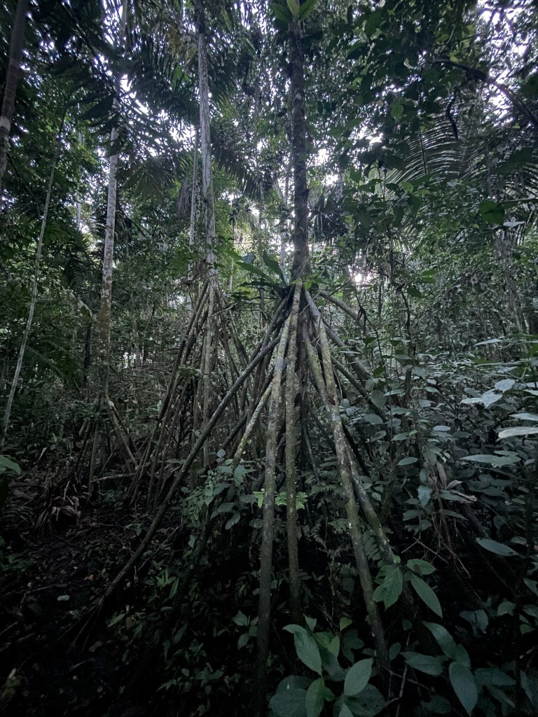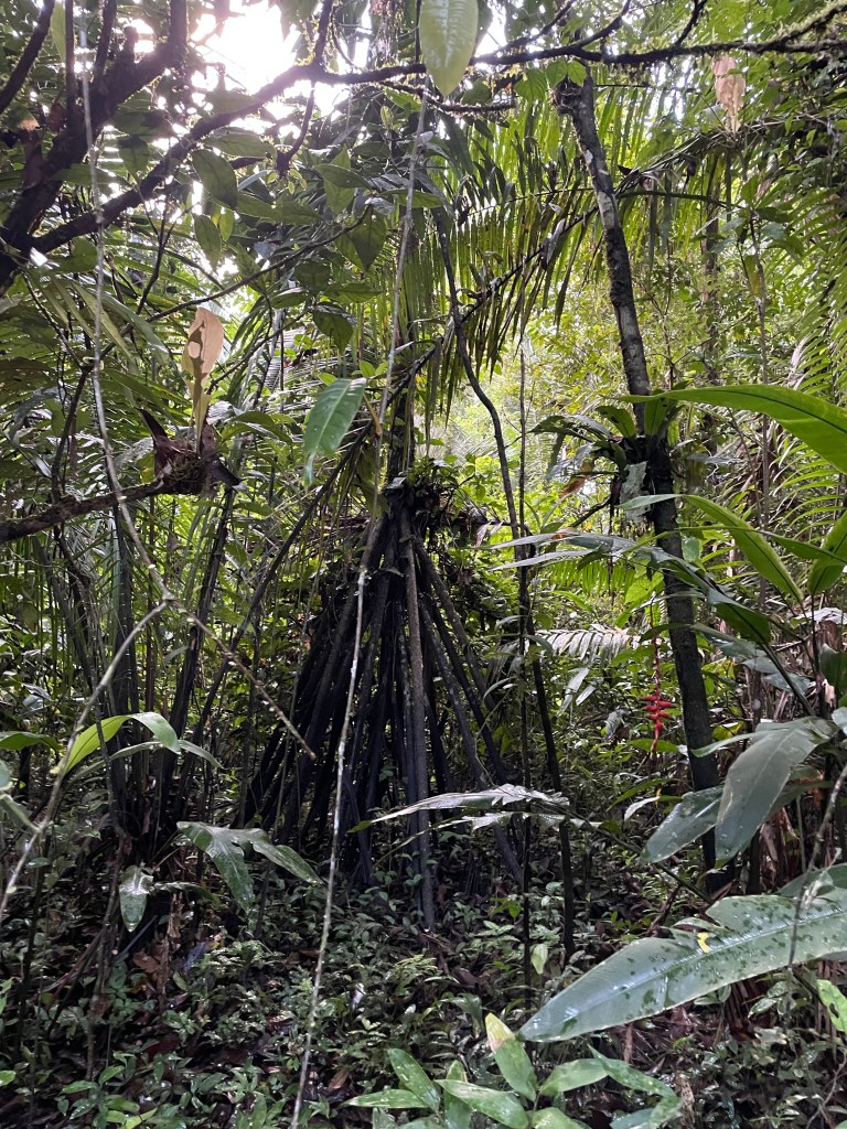 The walking palm – has a nest of roots which looks like a wigwam or a witches broom, probably extending 4-5m from the base. These trees move, they actually walk, a metre or more a year (sources vary – BBC claims 20m!)