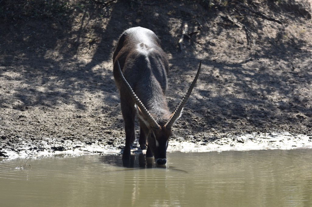 As the heat of the day built, we decamped to the bird hide overlooking a small waterhole. We watched mongooses and go-away birds drink, as well as a majestic waterbuck who visited us twice.