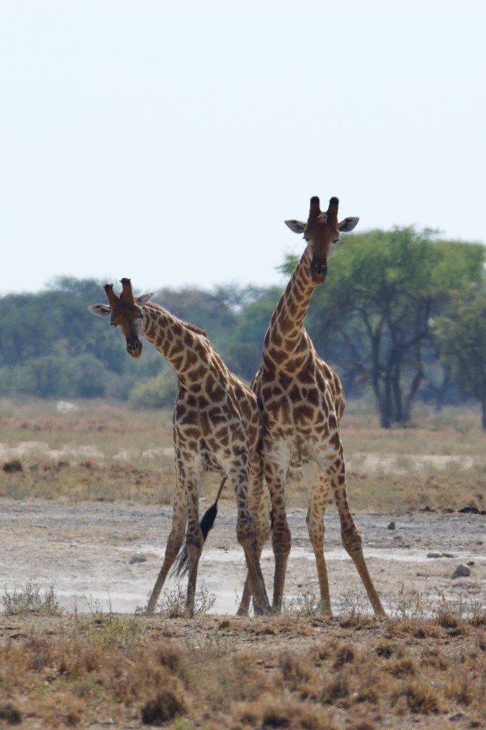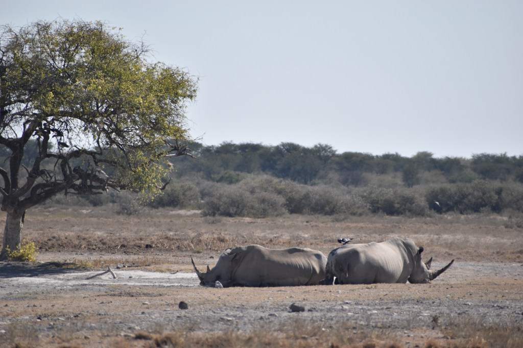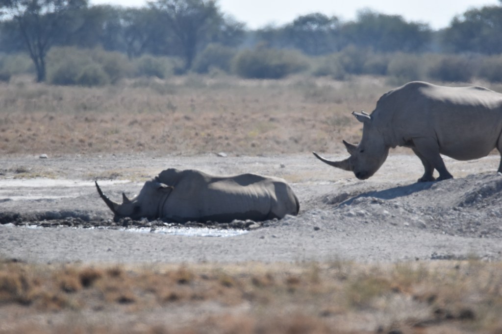 Returning for lunch we took one last detour to the pan viewpoint. A couple of giraffes were play-fighting. We almost left when we noticed that directly behind the giraffes were three white rhino. There were two adults and a baby, all of them enormous. The two adults still had their magnificent horns intact.