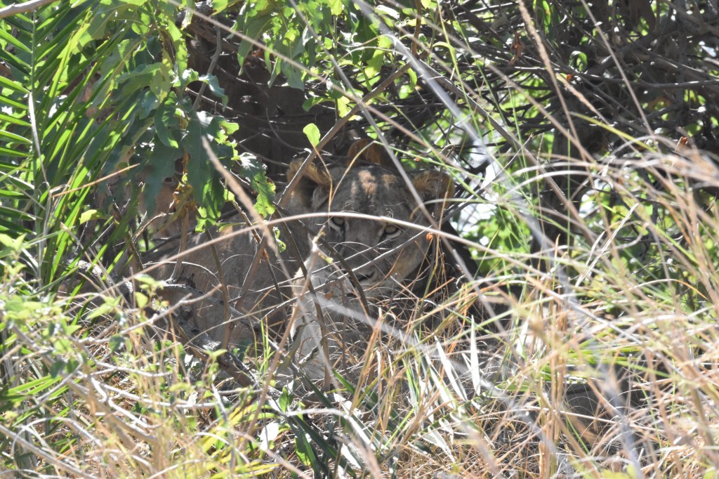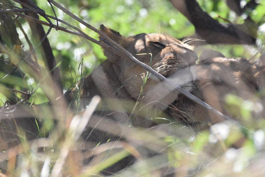 There were many skeletons of red lechwe around, this is lion country, and the prides here are notorious. We scoured the plains for signs of the lions, but by now they were firmly hidden and sleeping under a thicket. Luckily the guides are in the know, and there’s a network of people who might know where to find them. After asking around a little bit, Oscar managed to find us a small pride of four lion sleeping under a bush right outside shumba camp. Sleeping lions don’t do much, they wake up as you approach, have a look at you, and then go straight back to sleeping. We didn’t exactly have a great view, so we soon departed.