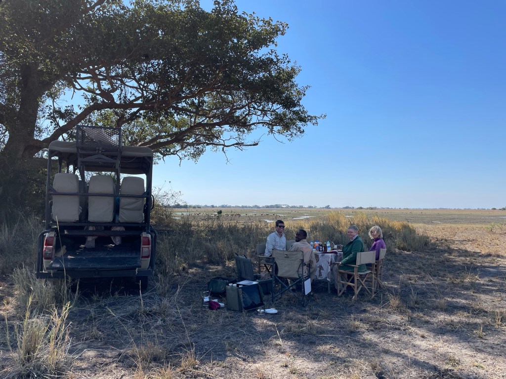 Oscar the guide picked us up at 5:30. It was nice to be driven for a change, although in the back of the open game viewer the air was freezing. We had been given blankets and hot water bottles, but my toes soon went numb. We had arranged for a full day drive, and it would take us a full hour and a half to reach Busanga plains.