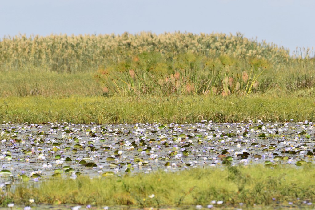 The boat was a canoe, fit for all of us (unlike in the Amazon). We were punted along by two locals, eager to help us find the shoebills. We set off upstream into the swamp. The Lavushi Manda river flows into the marshland area, joining the Luapula river downstream of Nsobe camp. The Luapula is one of the four great rivers of Zambia, forming a large part of the countries northern border with the Congo. The water here ends up in the Atlantic Ocean via the river Congo.