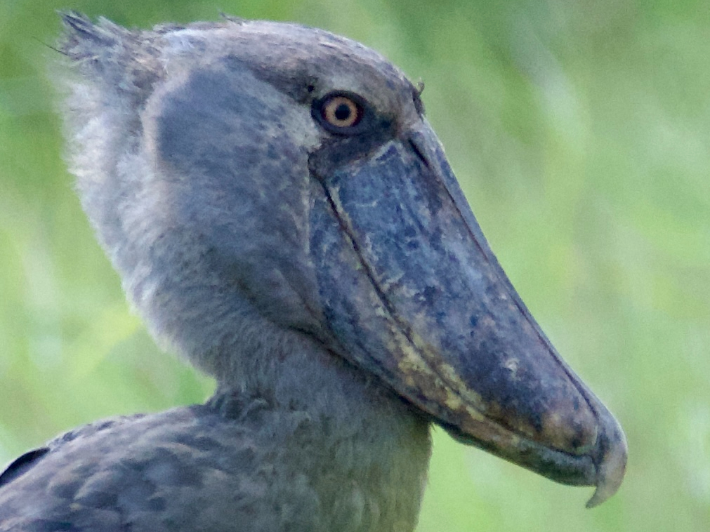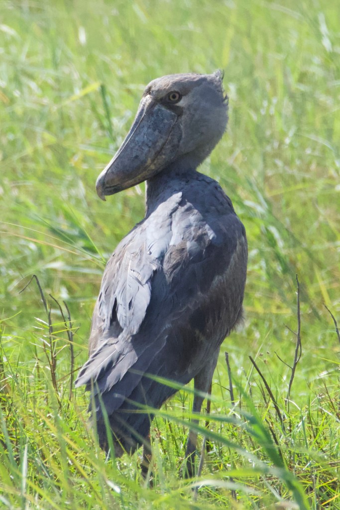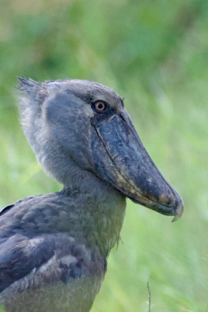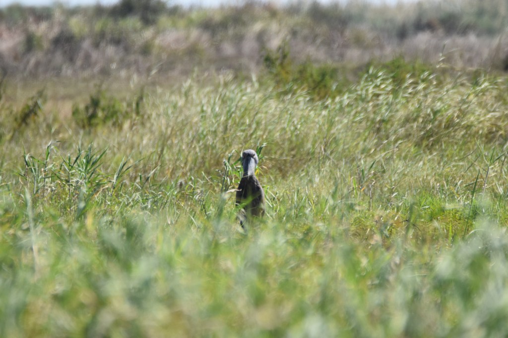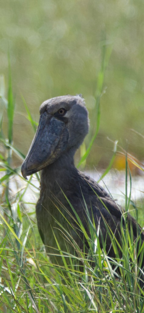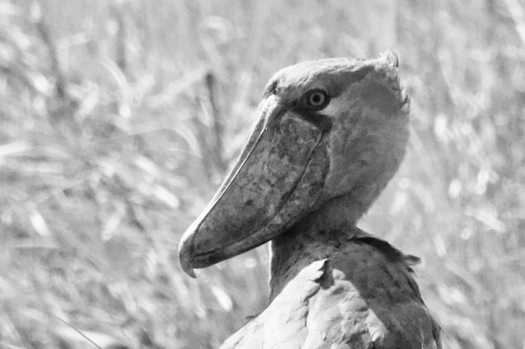 After many hours travelling upstream, and without a shoebill sighting, we decided to call it a day and head back. Suddenly the punters crashed us into the bank, near where we had seen the fishermen’s hut an hour or so earlier. The boatman on the bow had spotted the bird. One by one we crept up out of the boat, and peered over the reeds. The shoebill was a still grey pillar, not unlike a Roman statue. An enormous wide beak with an aggressively hooked tip weighed down its head. A small tuft at the back of its head giving it the look of someone just out of bed. We poled a little closer to get a better look. We were within 30m and the shoebill mostly ignored us. We let it be, and returned back to the harbour.