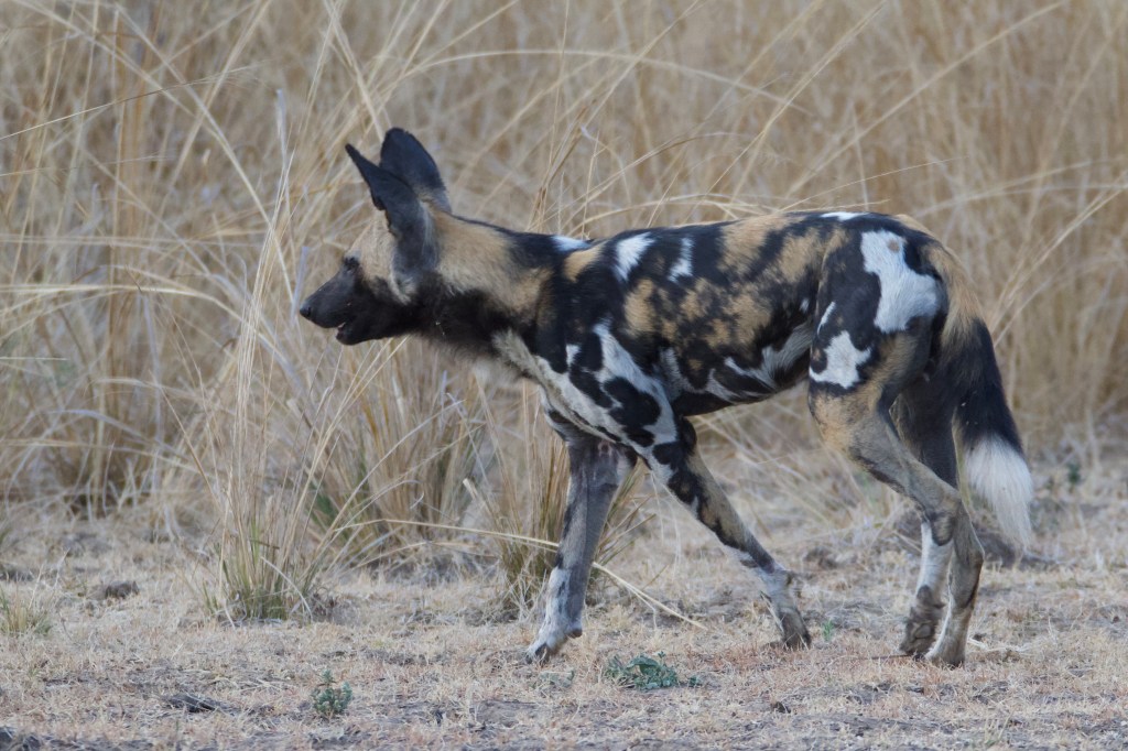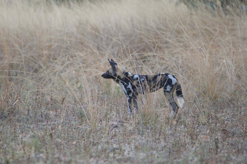 Finding wild dogs is the most difficult task for a self driver, the only reliable strategy is to spend enough time on the road so eventually you run into them, or more accurately, they run into you. There is of course a bit more nuance to this effort, but the gist is the same. We were given a helping hand by a small group of buffalo, whose attention was firmly directed towards the dogs on the edge of the plain, and not at us. We raced down to find them, and spent a brief minute with the pack of eight dogs before they trotted off into the distance. These were quite a pretty pack of dogs, more patterned than the ones in Liuwa. Most noticeably there was one very white coloured dog whose almost entire body was a surprisingly clean white colour.