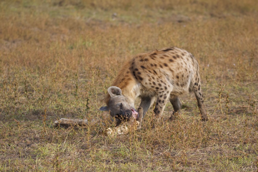 Shortly after dawn we made our way to the far end of the dry Wafwa ox-bow. There we found three hyenas picking at the long-dead remains of a giraffe. Hyenas are nocturnal, and usually quite skittish, so it was a treat to see them in the morning light enjoying themselves.