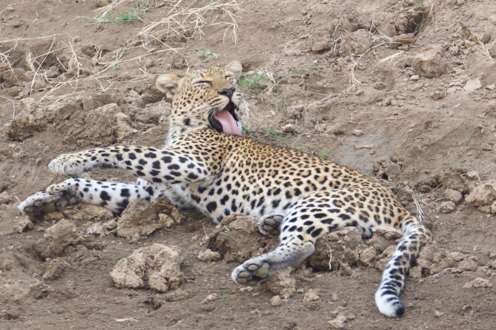We spent far too long chatting to Philemon, and had to race back to the gate in time for the 6pm curfew for self-drivers. We made it just in the nick of time, but not before we got one more sighting of a leopard, this time the best of the lot. In the dying evening sun, a male leopard was strolling across the open ground to begin his nightly activities. When we first saw him he was sitting still, on the dry mud, and yet perfectly camouflaged. Dust was lingering in the air from a nearby buffalo herd, and we would have driven straight past had the guide in the lone game viewer not alerted us to his presence.