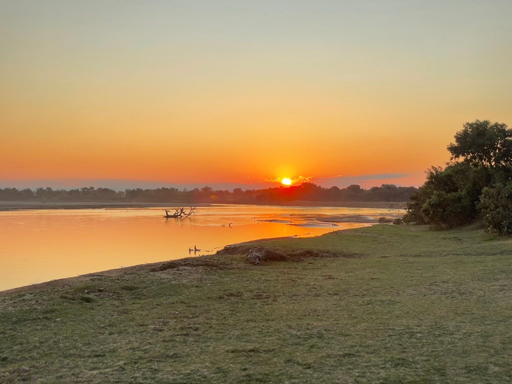 As night fell our evening drive has yielded precious little wildlife of interest. Althought we did at least experience a spectacular sunset down by the river. The South Luangwa spoils us in this regard every day and it’s easy to get complacent, there will always be another great sunset. Ruwan and Adron had begun to look a little harder, their whatsapp feed had dried up. As we were running out of time for the night we took a last, desperate move down to the riverside opposite Chinzombo. A herd of Impala were grazing peacefully on the grassland as Adron skimmed his flashlight over them, single green eyes reflecting back the torchlight indicating a large group of herbivores.