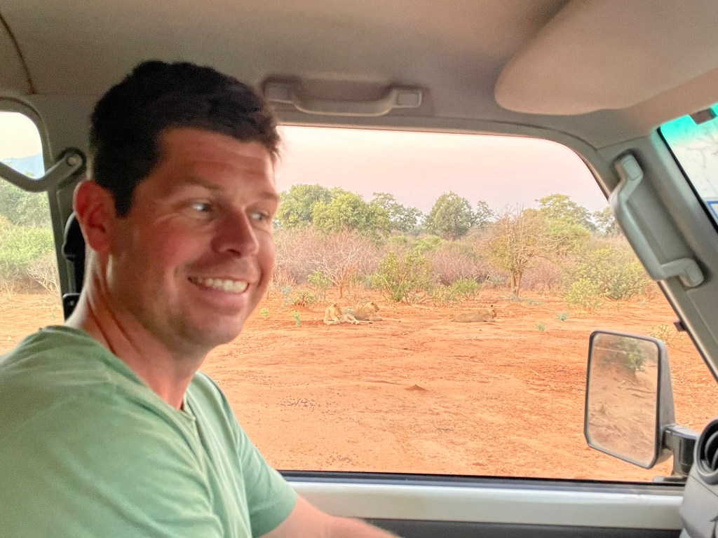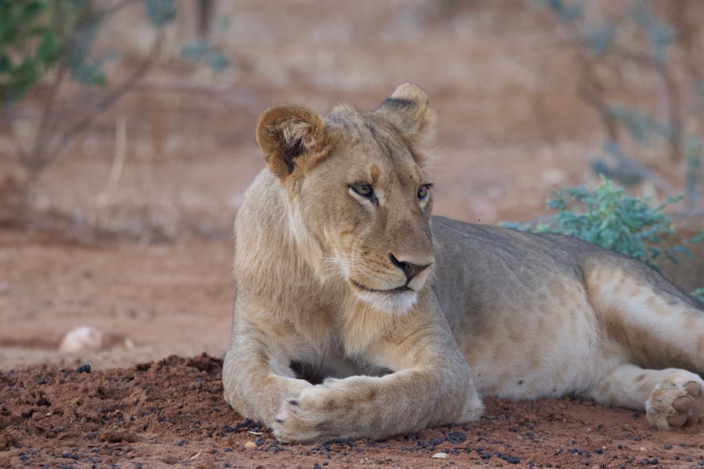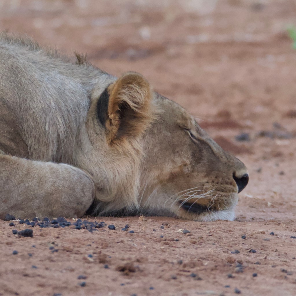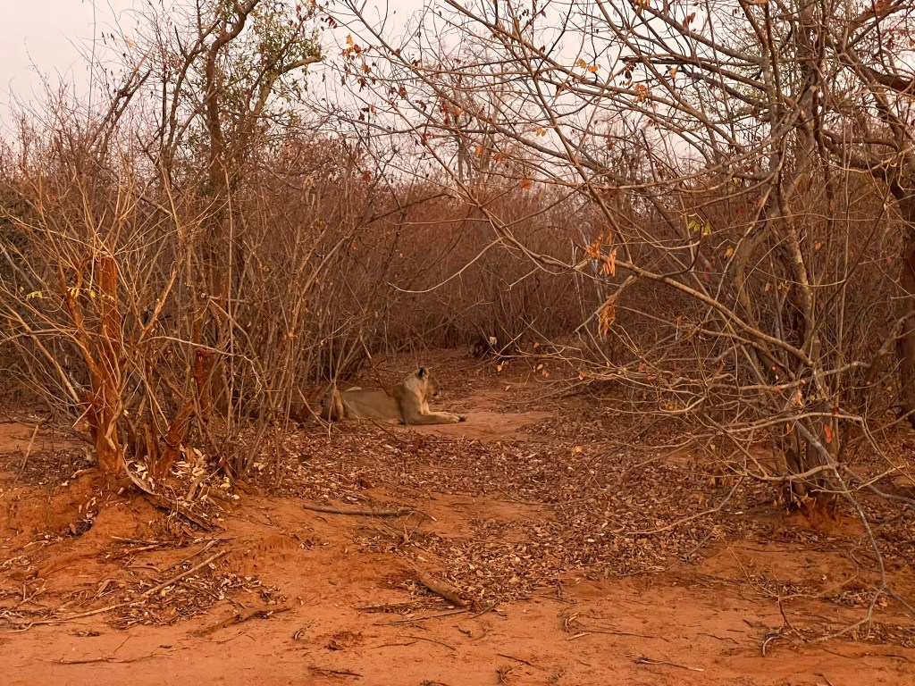We whizzed around the corner in an attempt to find a place to turn around and follow the dog’s tracks. What we didn’t bank on was the young male lion lying in the road on the inside of the bend. Good job Sarah was switched on or we’d almost of ran him over.