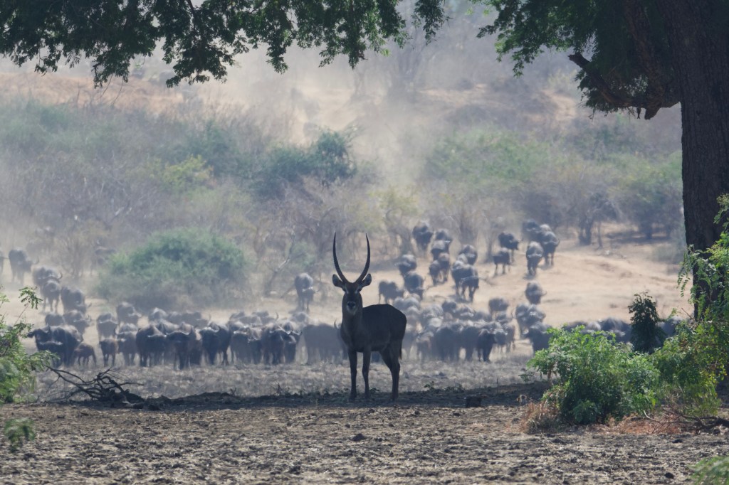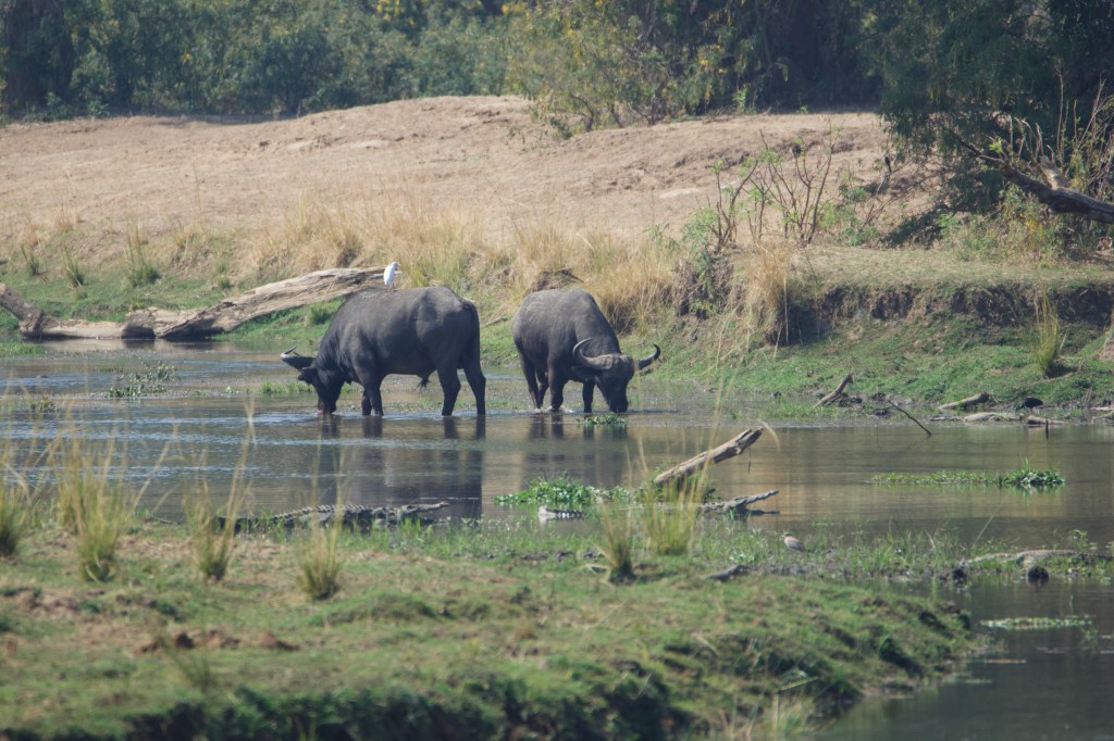 The two old boys were barely twenty metres away from us, each almost the size of a small car. The left one bobbed and shook his head at us in a vigorous nodding motion. There was no way around the buffalo, the black cotton soil either side of the road had been heavily poached in the we season, and now had dried solid, there was no way we could drive over it. Reversing back into the thicket was an option, but could easily provoke a charge all the same.