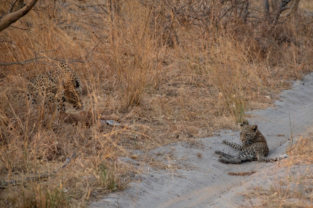 Just as hope appeared to be fading we took another look at the tracks, and Isaak declared them to be fresher than he had previously thought. We followed the track north for a couple of hundred metres, and there under a thicket at the side of the road was the leopard and her cub, and a dead steenbok for added measure.