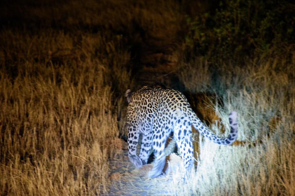 We set off towards the racket, and after a bit of off-roading we came across the leopard in the long-grass. A short glimpse of only a few seconds before it eluded us and slinked back off into the night.